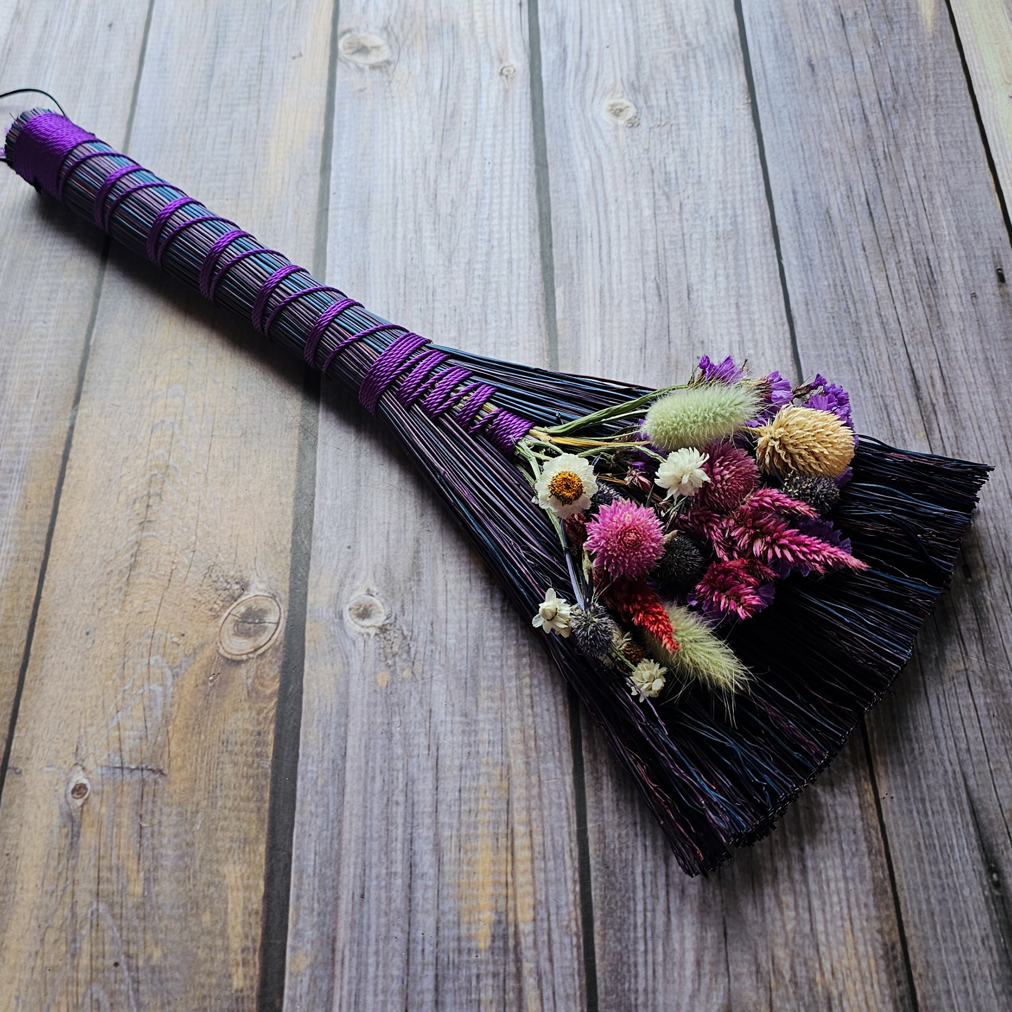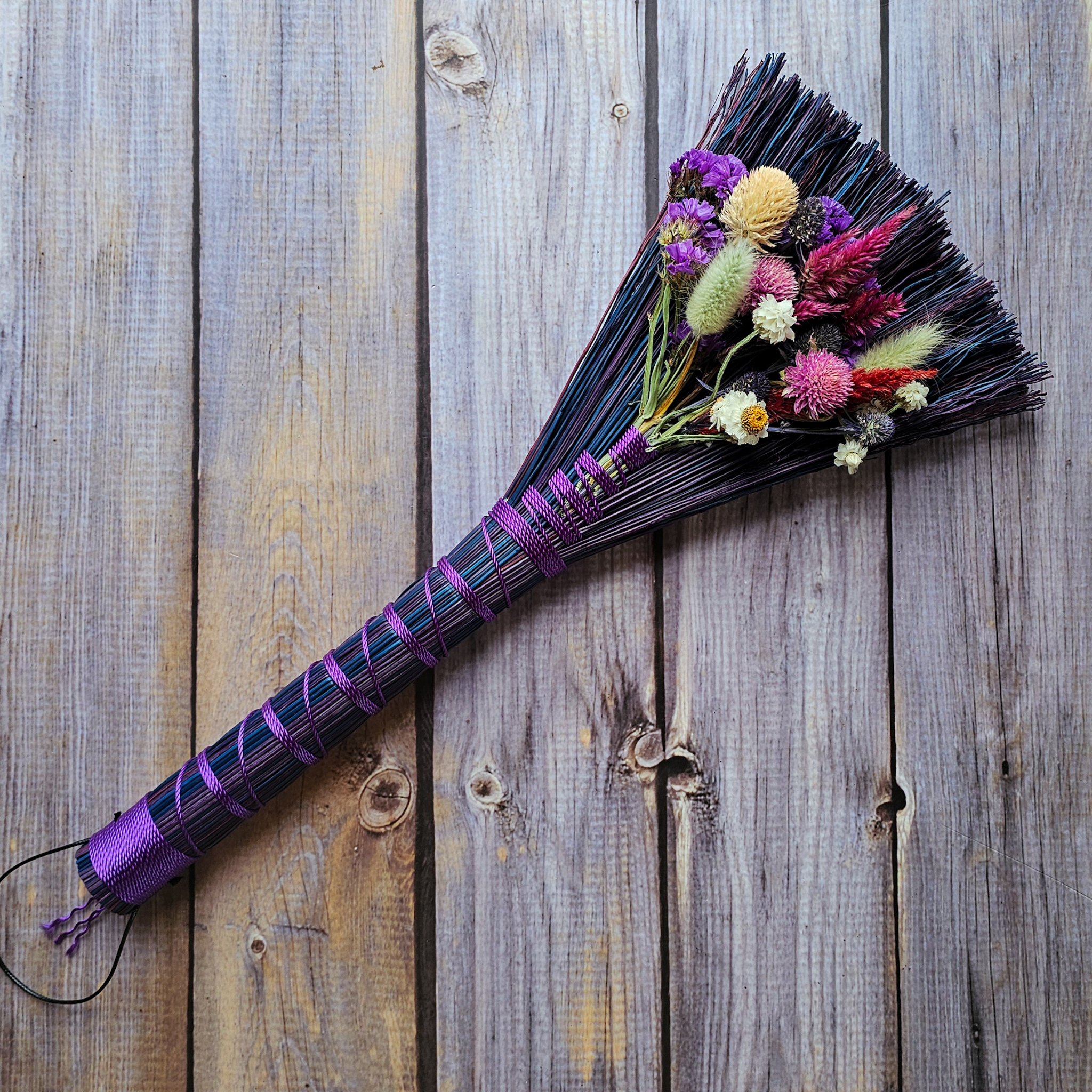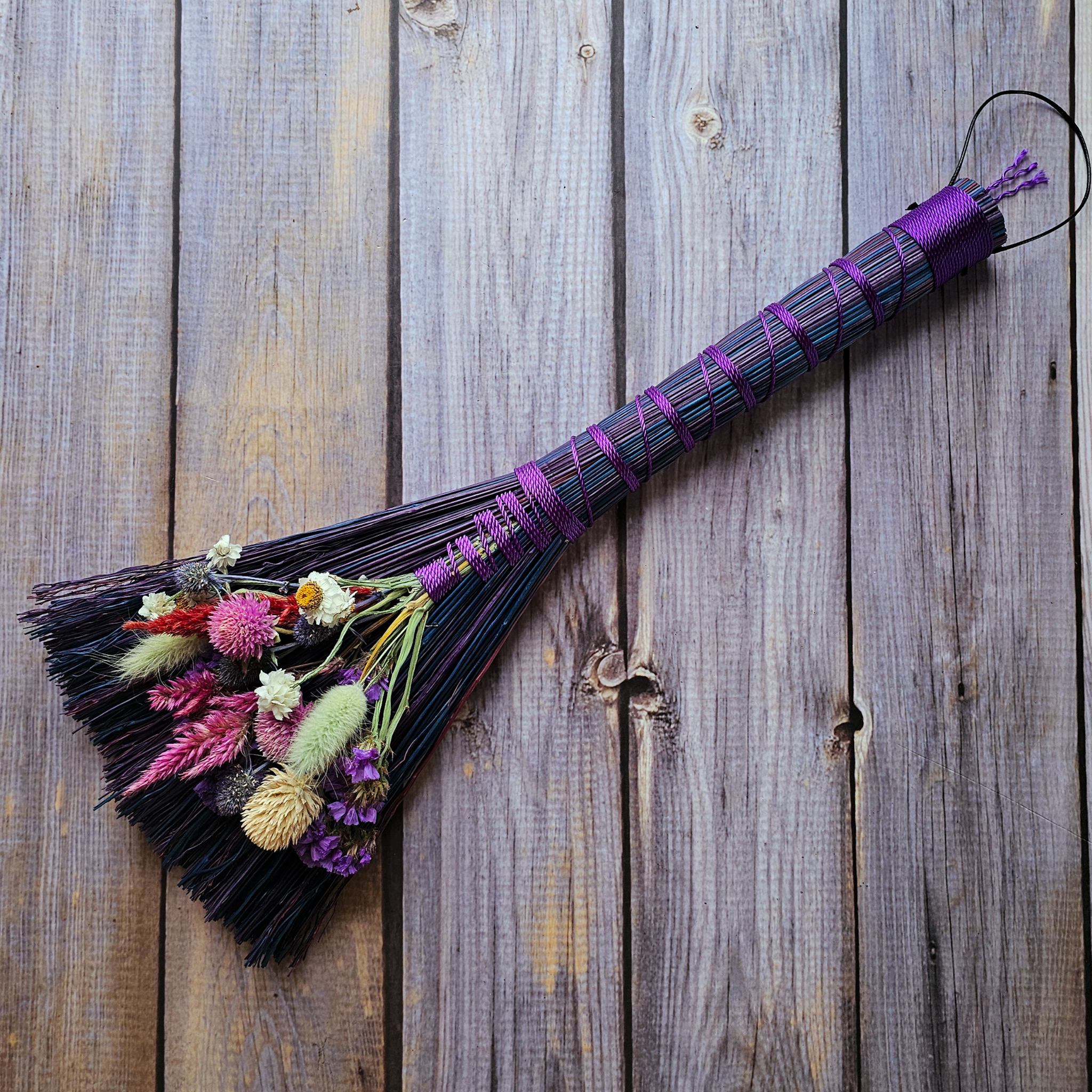 Traditionally, decorative brooms symbolize mindful clearing — sweeping away stagnant energy and welcoming fresh beginnings. Hang near an entryway, workspace, or sacred corner as a reminder to clear what no longer serves and invite in what does.