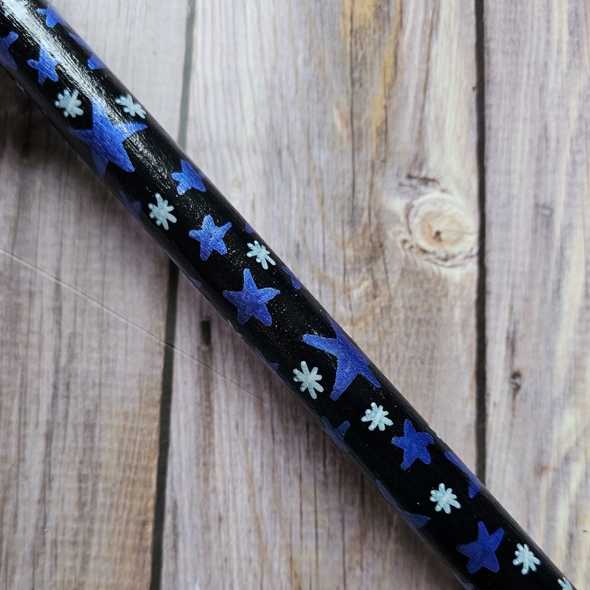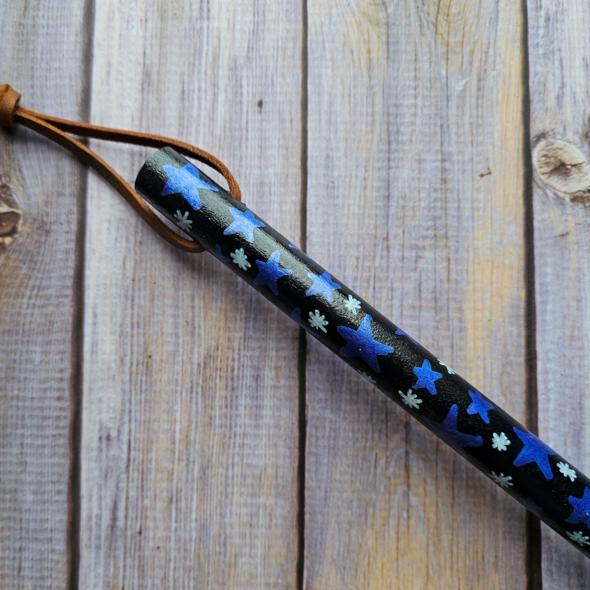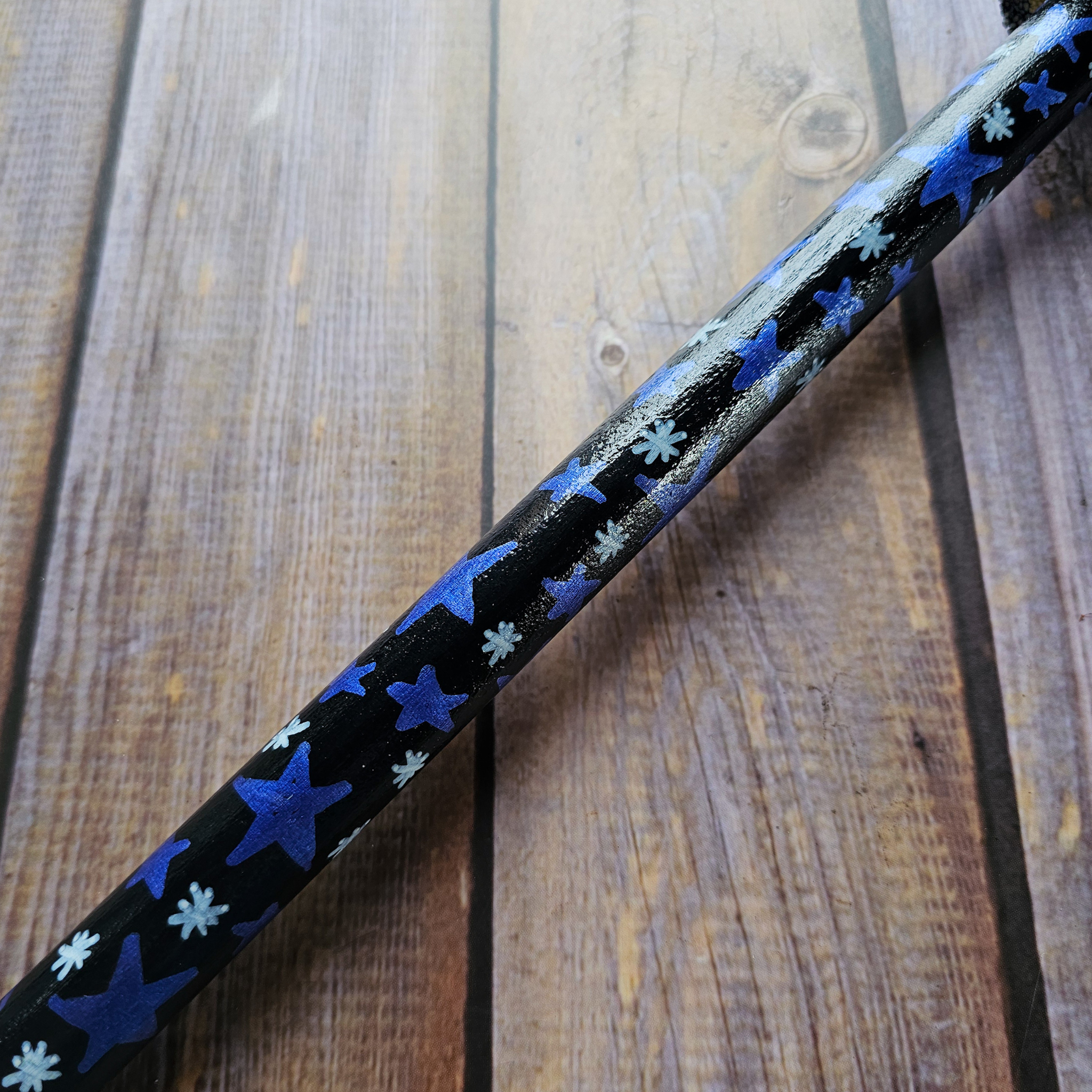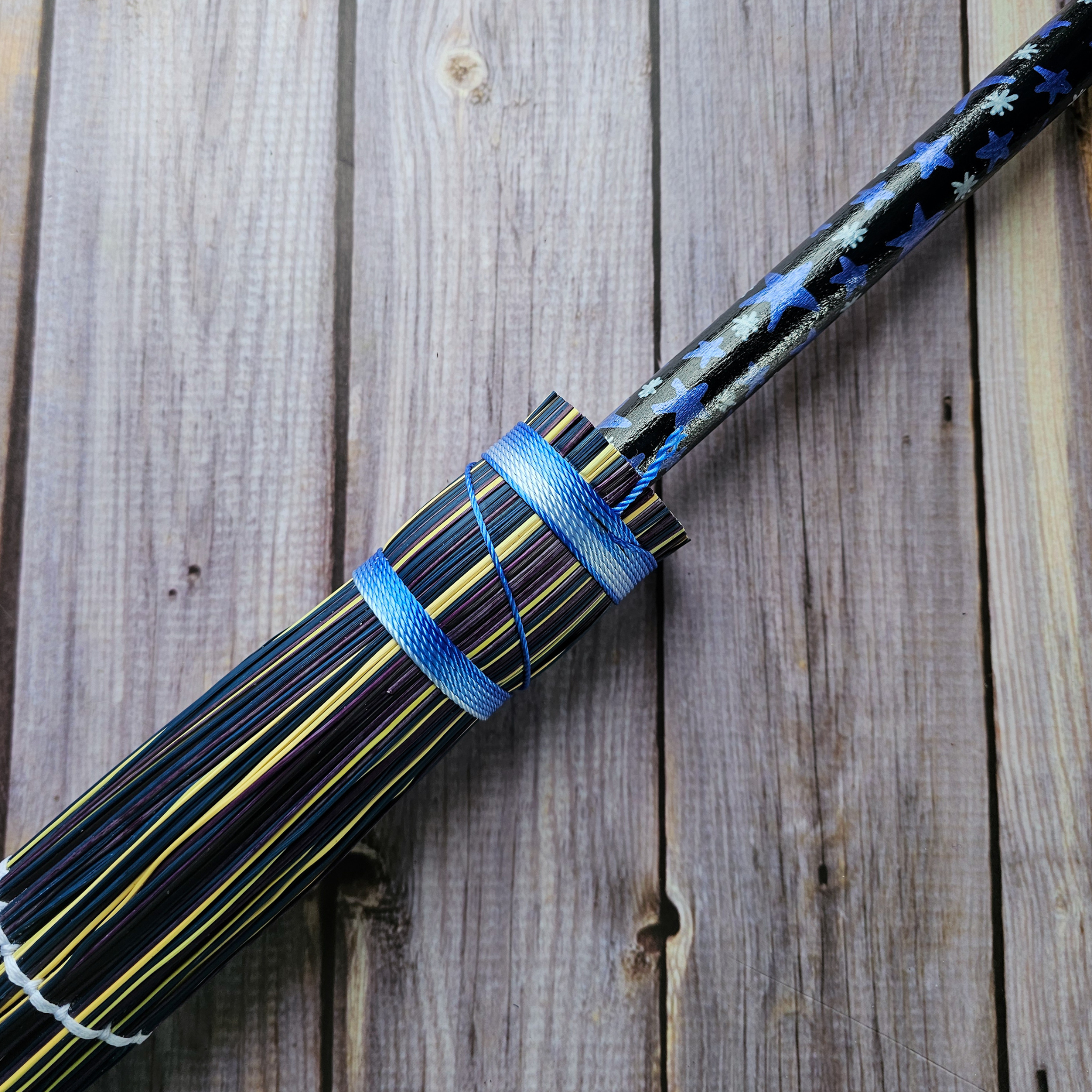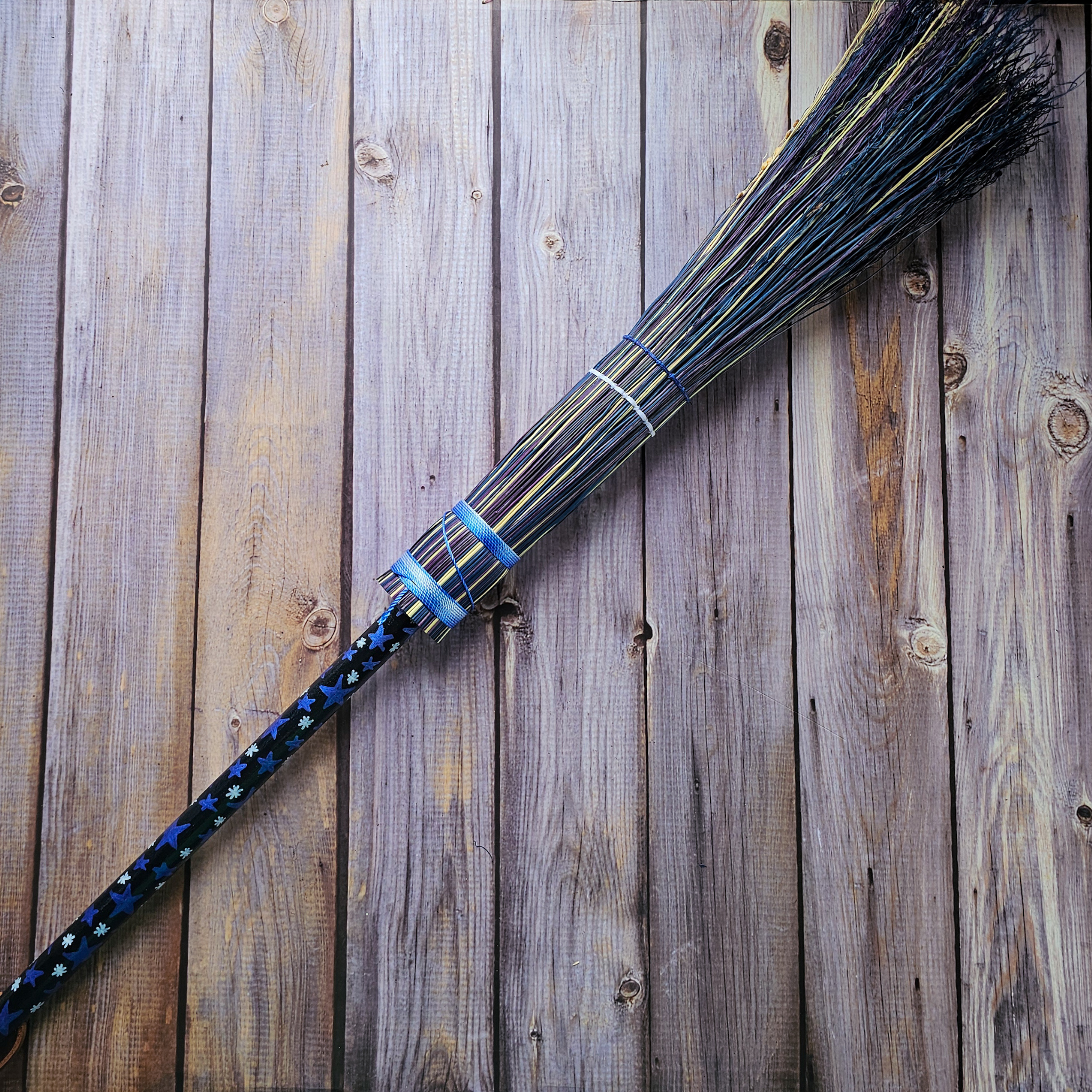 This handcrafted decorative broom is made with natural, black, blue, and purple broomcorn and a black hand-painted wooden handle with celestial motifs. Designed to bring beauty, intention, and gentle clearing into your space.