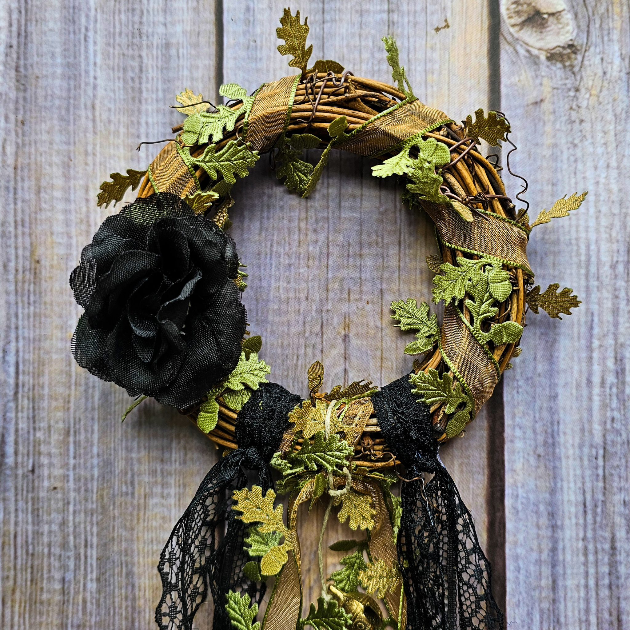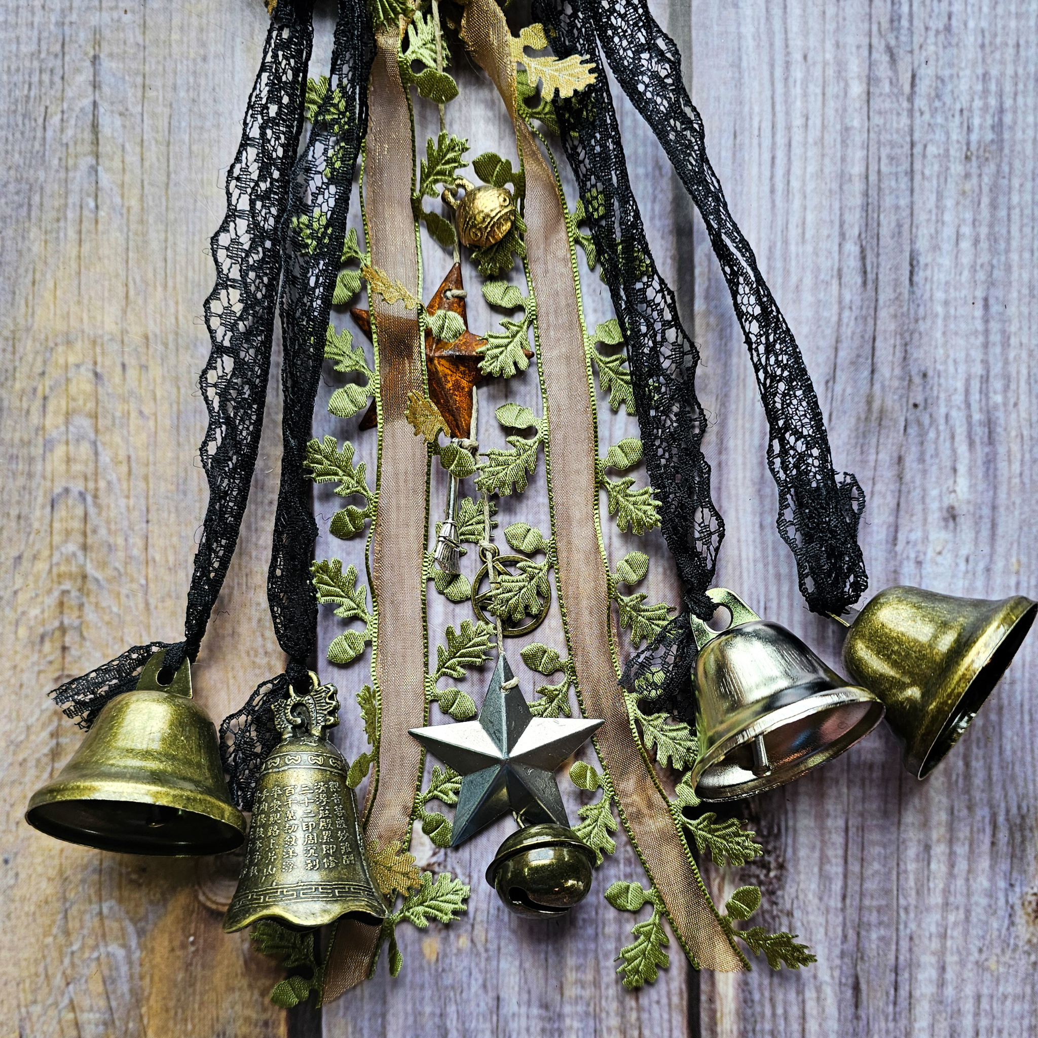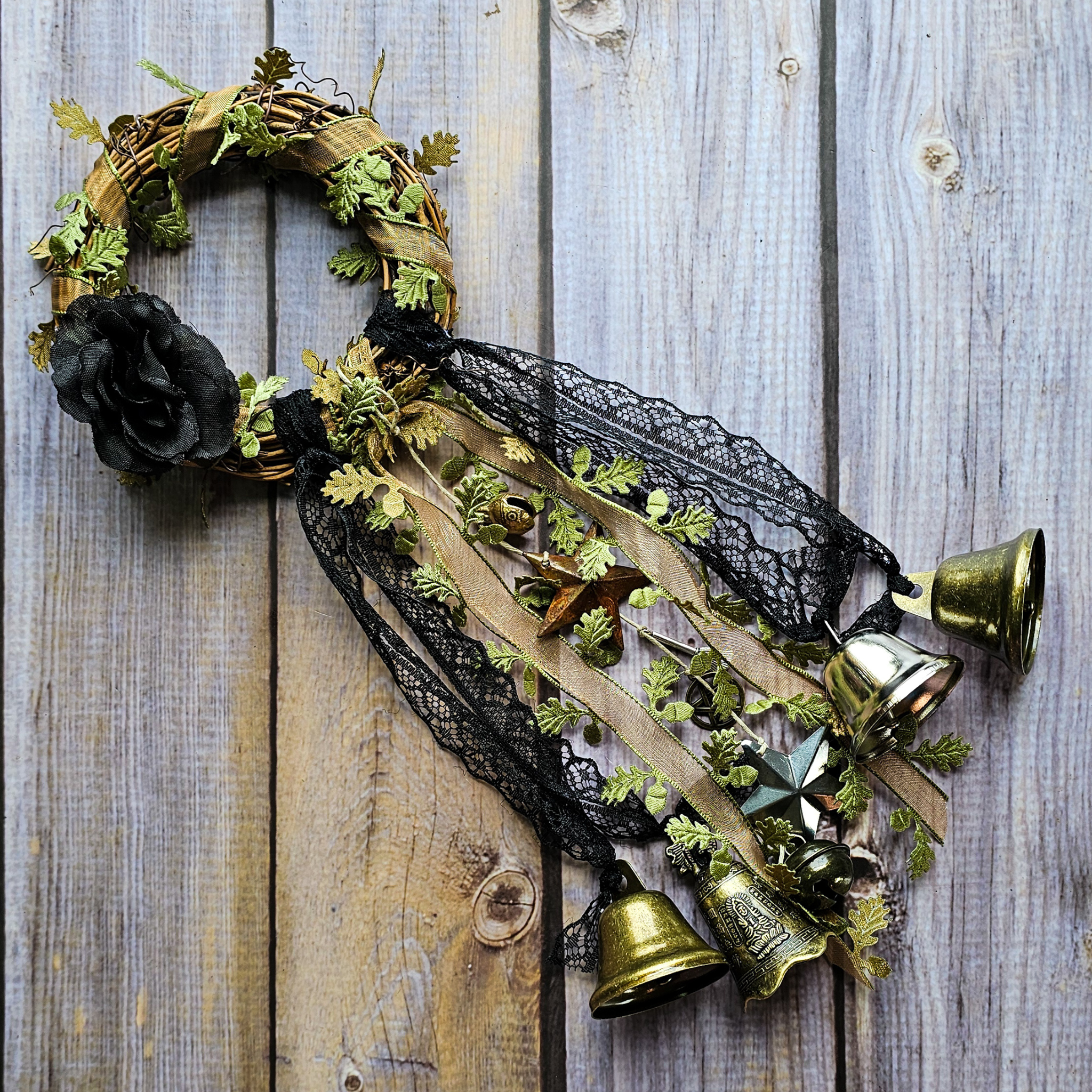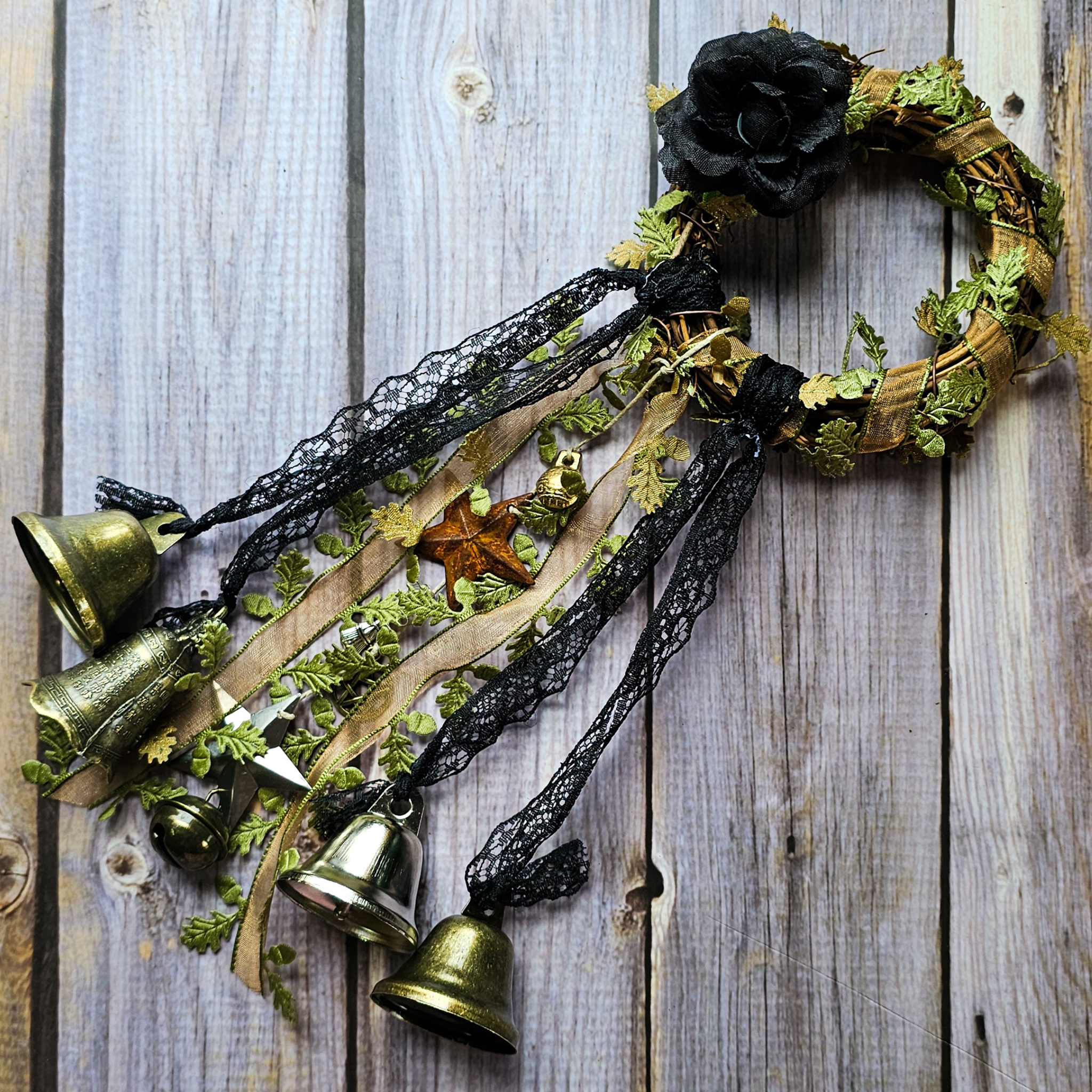 This listing is for one 4 inch Witches Bells grapevine wreath with ribbon, antique brass and silver tone bells, and witchy charms. Each wreath is made to order, and due to the nature of handmade items your Witches Bells will be similar in appearance but not exact to the stock photos. For example, the color of the charms may differ from gold/silver etc.ย
